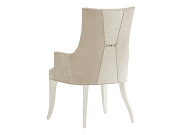 The Geneva arm chair offers a stylish, fashionable designer look to dining room seating. Bespoke tailoring includes hourglass pleating on the outside back, bridged with a decorative buckle in polished nickel. Deep concave chair backs afford guests exceptional comfort while complementing the graceful shape of the dining table. You may choose to personalize with custom fabric as item 415-883.