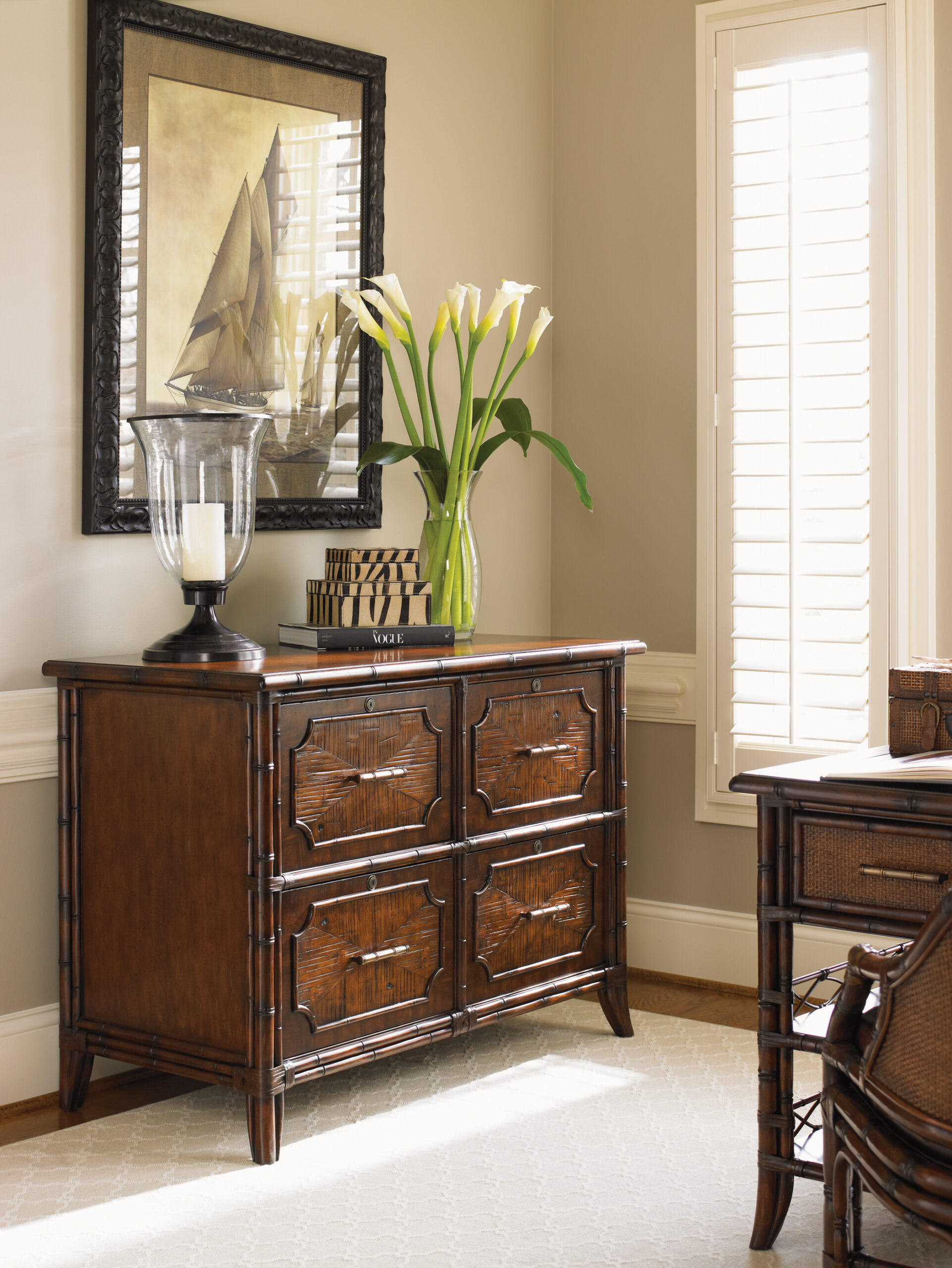 Four locking full extension file drawers with elegant crushed bamboo drawer fronts are complemented by rattan trim. Features convenient cord management and aged brass hardware.