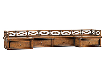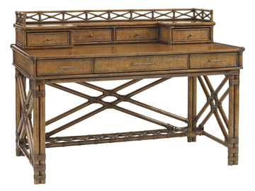 Offering exceptional detailing, this writing desk features woven raffia on all sides, leather wrapped decorative cross stretchers on the front and sides. The desk has three drawers with raffia fronts for storage. For additional storage, choose the desk combination 593-933C with the Enchanted Isle box of drawers, which consists of four drawers and a decorative gallery of leather wrapped rattan.