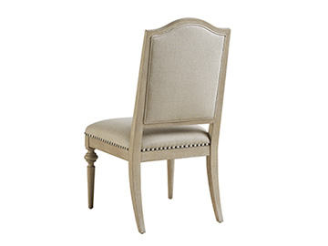 The Aidan dining chair design features a graceful arched top, smoked nickel nailhead trim on the seat and inside back, with turnings on the front tapered legs. The standard fabric, Moonshadow, is 100% natural linen in an ivory and fawn coloration with an exceptionally soft hand. However, COM and custom fabrics, leathers, and a combination is available for an upcharge as 926-880.