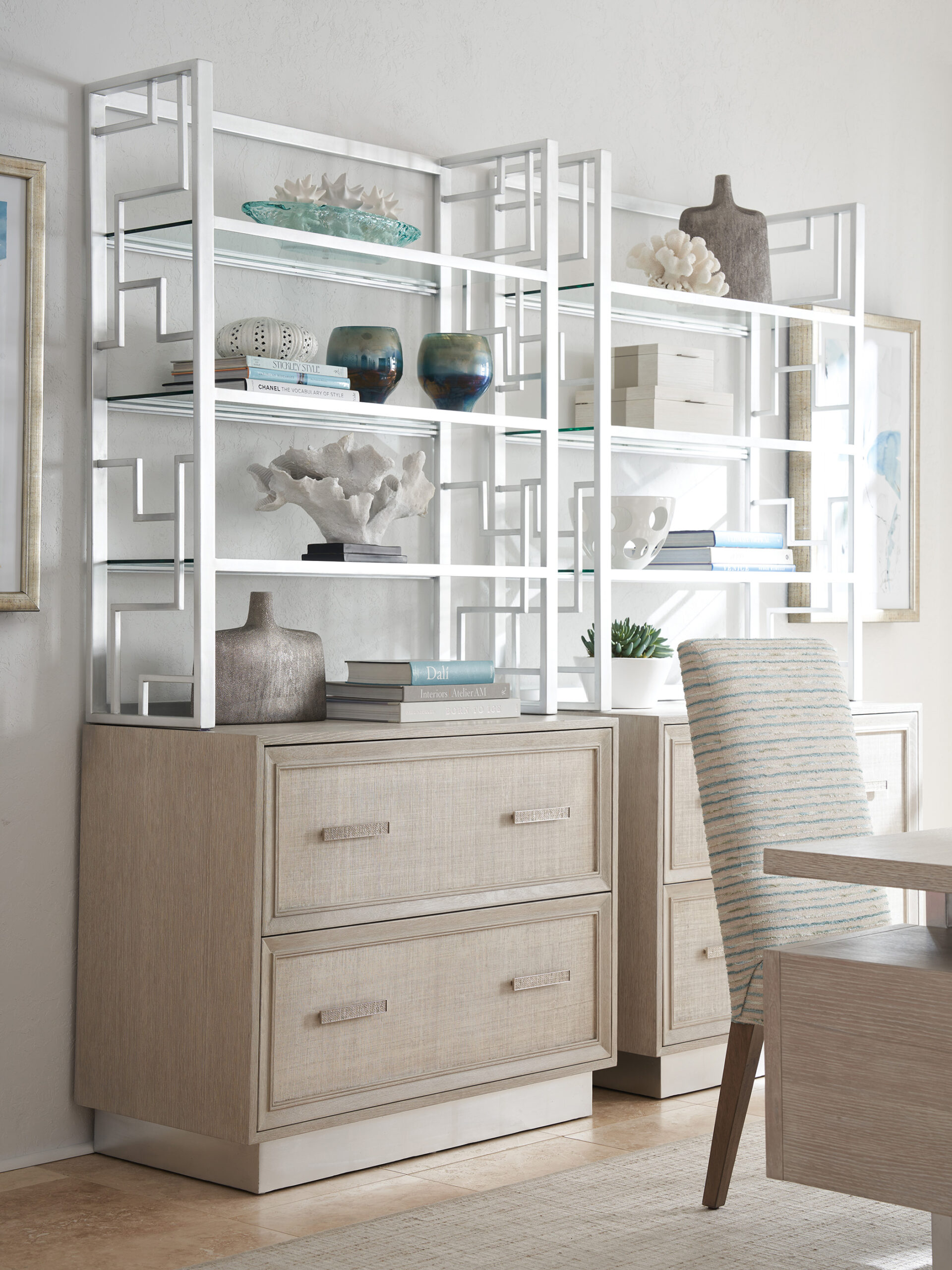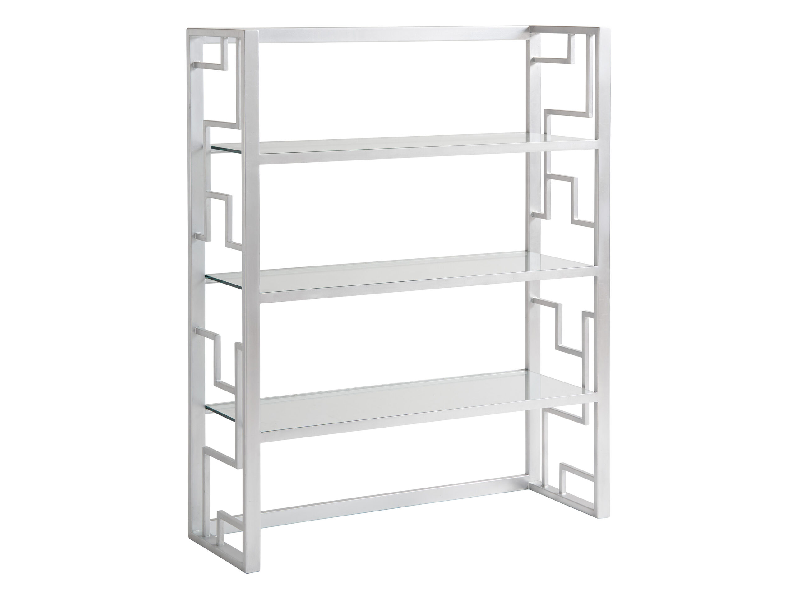 Contemporary designed metal frame and decorative fretwork in silver leaf finish with three stationary glass shelves and an open back. The Wheaton Deck complements the -450 Wheaton File Chest.
