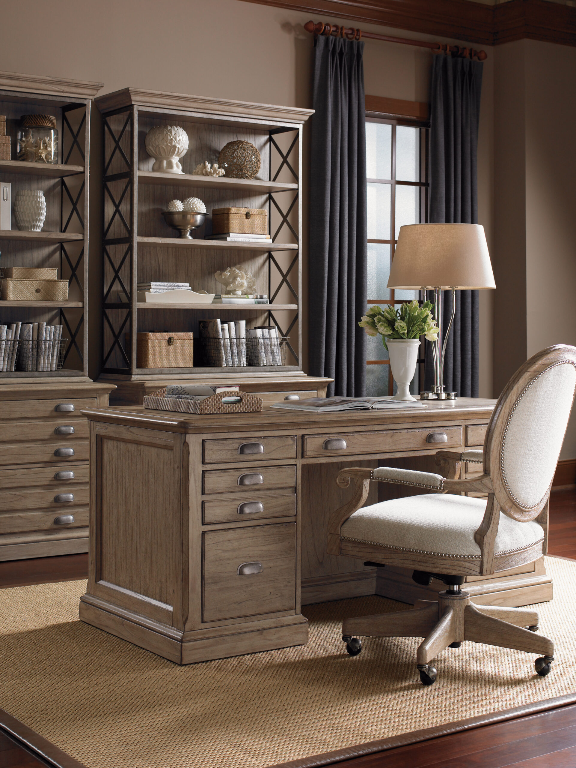The three piece top in a buffalo grained gray complements the weathered driftwood finish. Features include a flip-down center drawer with ergonomic palm rest, two pencil and two box drawers, and two file drawers on ball bearing slides.