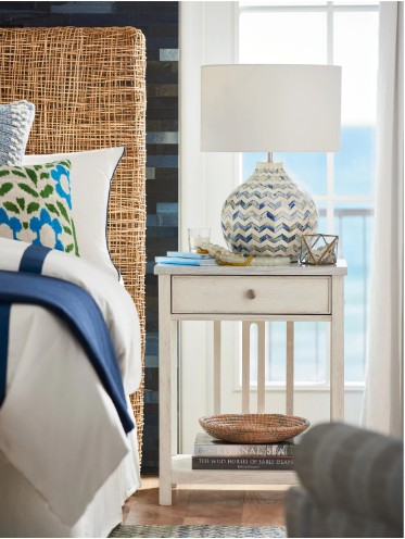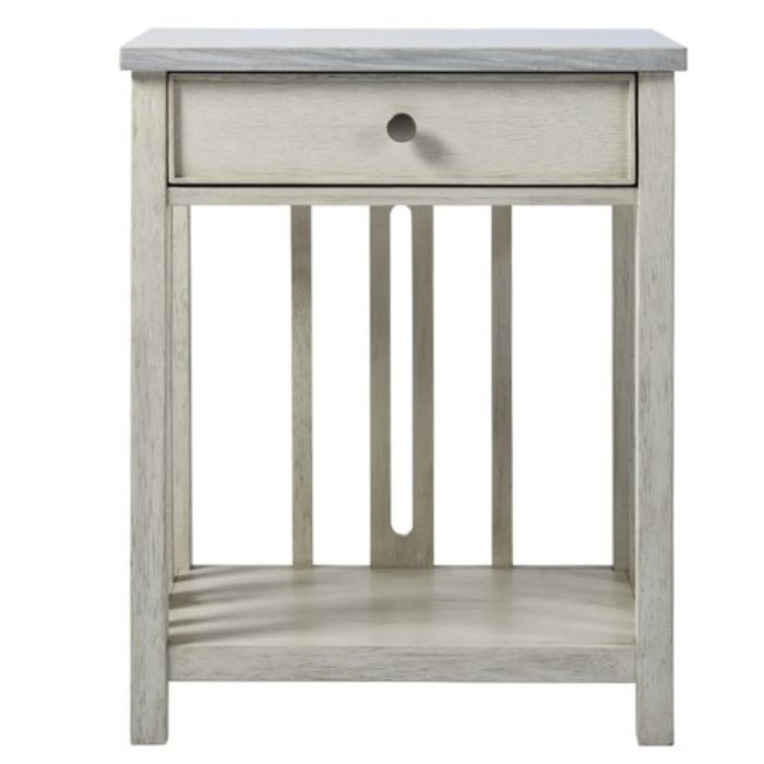 Artfully combining textures and tones, the Escape Bedside Table with Stone Top features one storage drawer, an open-air display shelf, and relaxed linear detailing.