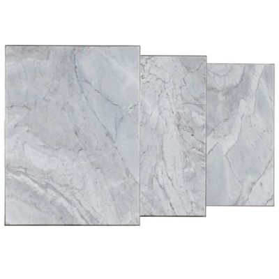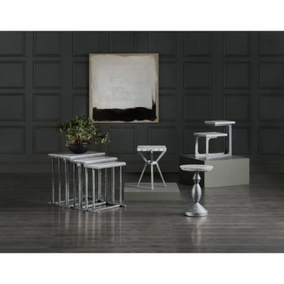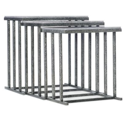 With the look of metal tapestry, the set of three Bianca Nesting Tables have tactile and textural distressed gray metal bases and San Juan Slate stone tops.