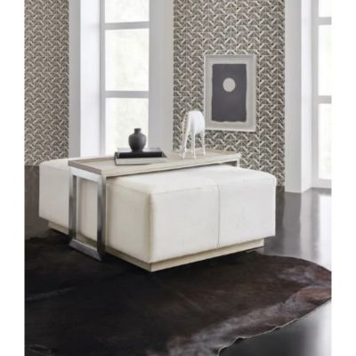 In a user-friendly modern design, the rectangle-shaped Bridged Cocktail Table is upholstered in cream-colored hair-on-hide leather and features a convenient mobile tray top for keeping beverages, snacks or electronics within reach. The tray-top legs are metal-wrapped with a light-finished wood top that matches the wood plinth base.