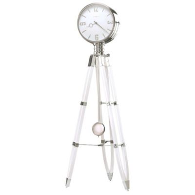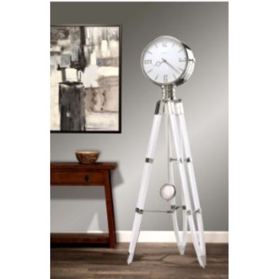 Style: This grandfather clock screams retro vibes thanks to its high-gloss white on select hardwoods and veneers along with polished, chrome-finished metal accents and a stationary white dial with chrome-finished Arabic numerals, hour markers, and hands. The polished, chrome-finished pendulum bob is suspended on a white high-gloss finished wooden stick that creates a linear design from top to bottom.