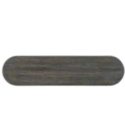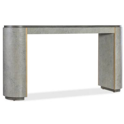 With the design flair of a luxurious fashion accessory, the Dylian Console Table has a gray crocodile exterior with gold metal accents and a dark wood top and base. Crafted of Pine Veneers and Robus Leather, it has an oval shape and measures 64 inches wide by 16 inches deep.