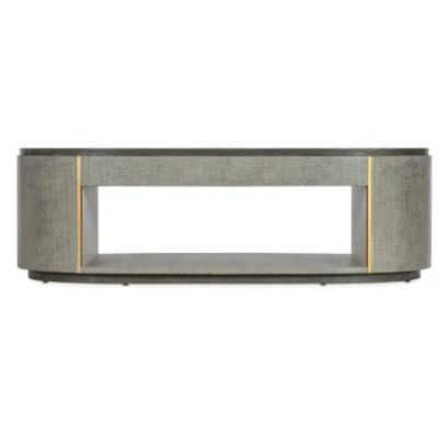 With the design flair of a luxurious fashion accessory, the Dylian Coffee Table has a gray crocodile exterior with gold metal accents and a dark wood top and base. Crafted of Pine Veneers and Robus Leather, it has an oval shape with an open shelf area.