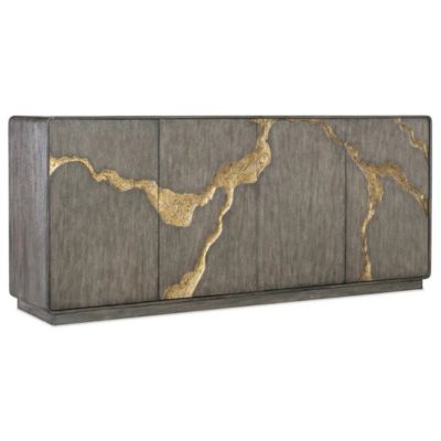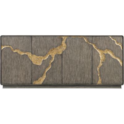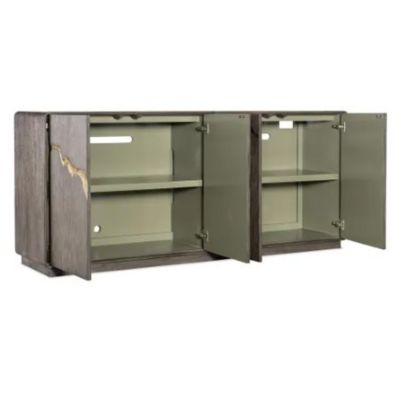 Earthy, elegant and organic, the Fissured Entertainment Credenza is crafted of Oak Veneers in a dark finish with gold-colored fissure-motifs across the door fronts. The interior is painted olive green. Featuring four doors with soft-close hinges and magnetic door catches, there is one adjustable shelf behind each pair of doors, 3-plug electrical outlets behind the right-side doors and a ventilated back panel.