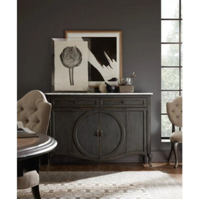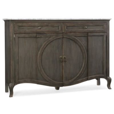 This chic and shapely credenza has a raised circle motif that dissects the center doors, classic cabriole legs and an elegant marble top. Almost too good to be true: this gorgeous piece is TV-ready with a ventilated back panel, two adjustable shelves and two drawers and will accommodate up to a 60-inch flat screen TV. Finish is a charcoal color.