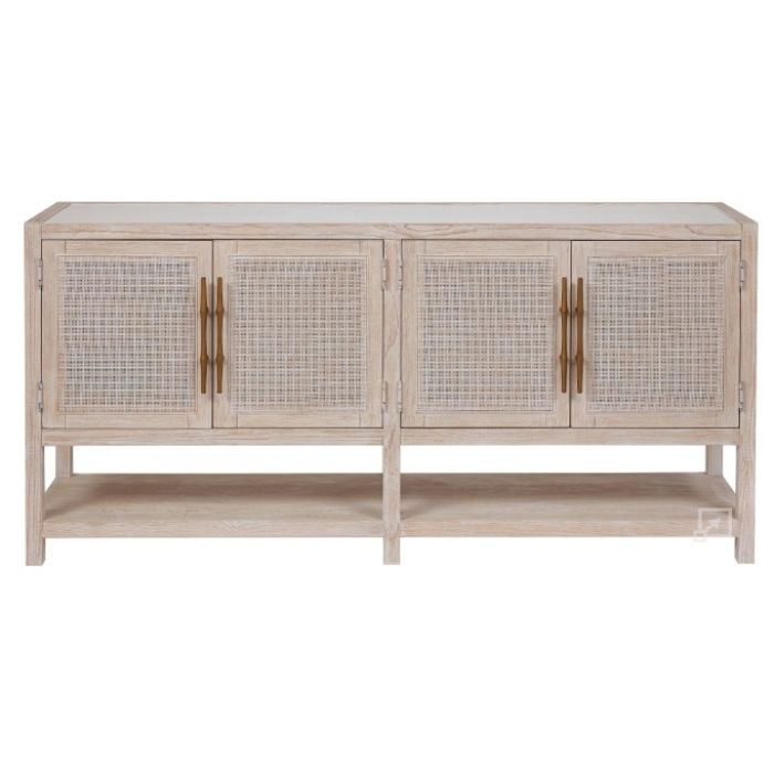 The Getaway Buffet packs a punch with lightly textured doors accented with sleek bronze hardware, open-air storage, two tray drawers and adjustable interior shelving, all finished in a serene, neutral hue.