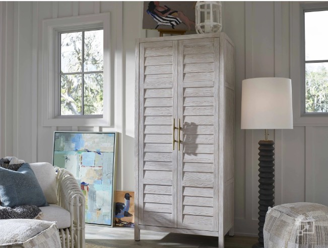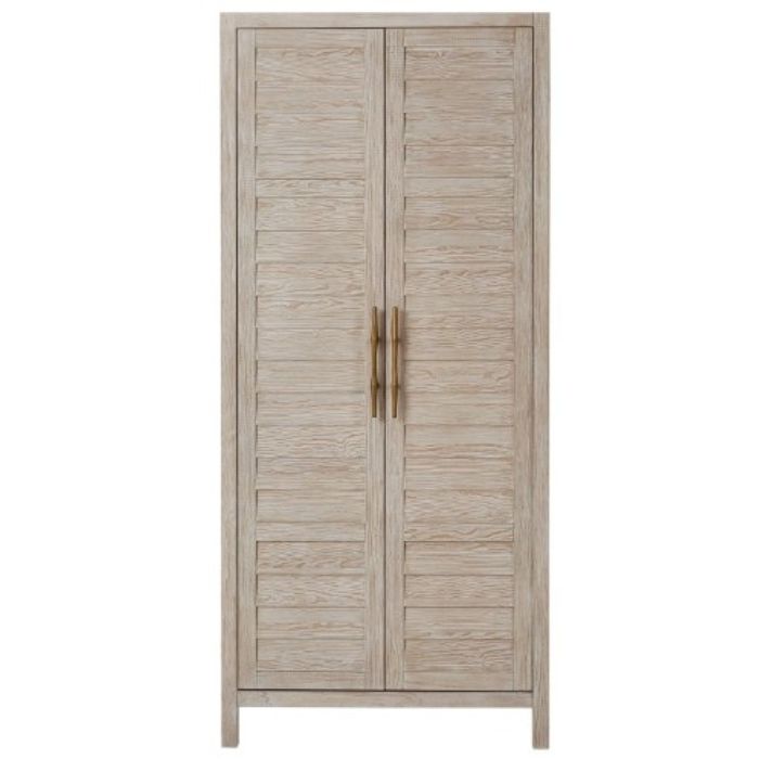 A stunning natural finish, perfectly paneled doors and sleek bronze bar hardware define the Getaway Utility Cabinet, an essential home storage piece.