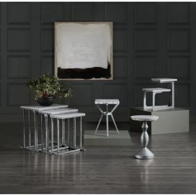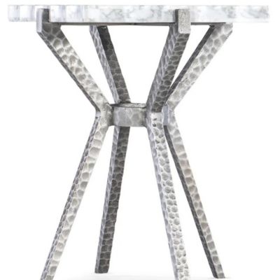 Industrial chic meets craftsman couture in the Glendon Side Table, combining a cast metal base in a silver distressed finish with a Carrara Marble Veneer top.