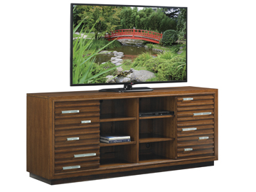 Pan-Asian design is at the center of this media console. Two sliding glass doors feature decorative glass accents that create an interesting play on materials. Fully functional, the console has three adjustable shelves. behind left and right side facing doors. The center has six adjustable shelves, ventilation and grommets for electrical cords. It can accommodate the Sligh Strong/Arm.