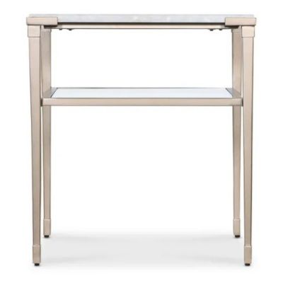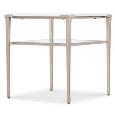 Add elegance and functionality to your living space with the Jen End Table from the Melange collection. This rectangular end table features a natural white stone top supported by slim, tapered champagne metal legs, offering a sleek and modern design. A convenient glass shelf provides additional storage or display space. Perfect for transitional or contemporary decor, this table blends timeless materials with clean, minimalist styling.