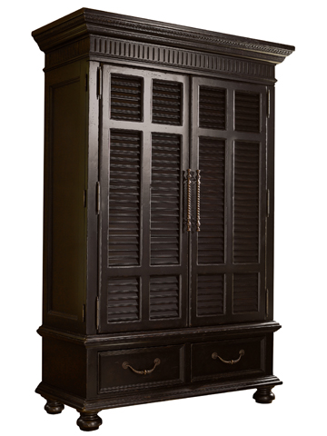 Paying tribute to British Colonial antiques with louvered doors and a distinctively distressed Tamarind finish. Wraparound doors open to reveal storage for clothing or media.