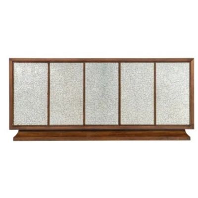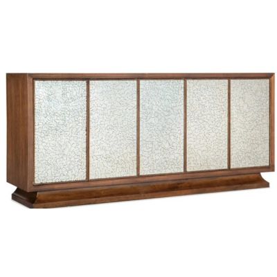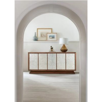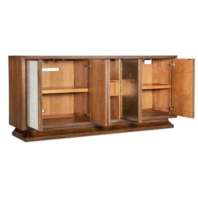 A case crafted of Walnut Veneers with glass and silver leaf doors creates a modern yet timeless and elegant piece with the Lloyd’s Leopard Entertainment Credenza. The Walnut Veneers are in a rich wood finish, with five painted silver leaf glass-front doors, soft-close hinges and magnetic touch latches. There’s one drawer behind the center door, and one adjustable shelf behind the left and right pairs of doors. The drawer creates one fixed shelf behind the center door. Accommodates up to an 80-inch TV.