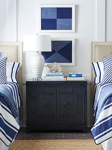 The 38-inch Collins bachelor’s chest features a striking geometric pattern of laser-cut fretwork on the doors, behind which are two adjustable shelves and grommets for wire management. This silhouette is available in the Sandstone, Sailcloth, Marine or Seaglass finishes for a totally custom look.