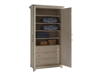 With a contemporary geometric pattern on the door panels and extraordinary custom pulls, the stately 88-inch tall Pacific Coast Cabinet makes a great statement as a single item or in pairs. The flexibility of the interior configuration makes the piece appropriate for bedroom or living room applications. Behind doors that open 180 degrees are three full-extension self-closing drawers, one stationary shelf and four adjustable shelves. The cabinet is available in the Sandstone or Sailcloth finishes