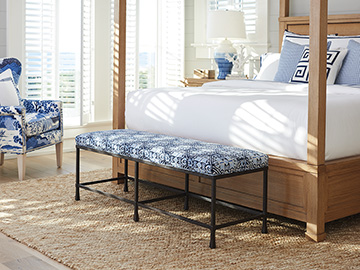 Blending style and function, the Ruby bed bench is an indispensable addition at the foot of any bed. The authenticity of hammered iron, finished in a textured aged bronze patina, offers a foundation upon which to add a touch of complementary color or texture to the room. The seat cushion is available in custom fabrics.