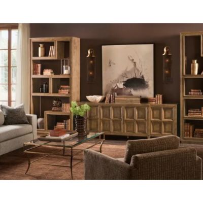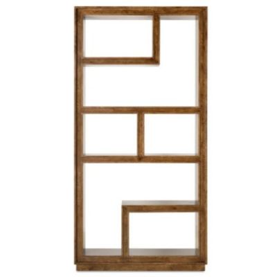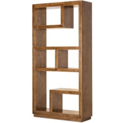 The Nikos Etagere brings modern artistry to storage with asymmetrical open shelving and six display cubbies. Built from oak solids and oak veneers in a rich golden-brown finish, this open bookshelf room divider is finished on all sides, so it can float beautifully in a space. A versatile transitional étagère for styling books, art, and accessories in offices or great rooms.
