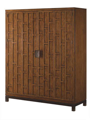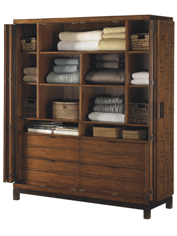The two piano hinge bi-fold doors retreat neatly to the sides revealing four drawers, six adjustable shelves, removable shirt partitions, and to aid with television display, a removable back panel, grommets for electrical cords, and an electrical outlet.