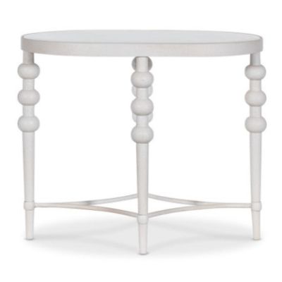 With its white textured finish and beveled glass inset, this oval end table brings light and elegance to your décor. Ideal for minimalist or coastal-inspired spaces.