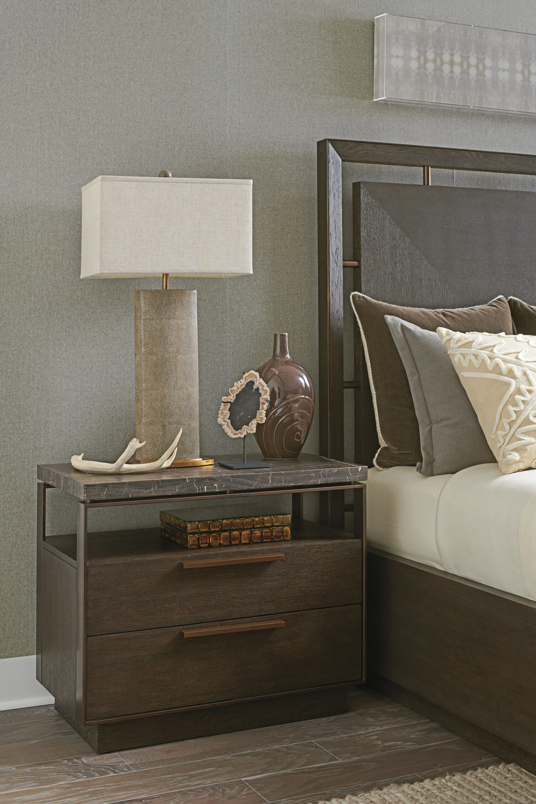 The exceptional design includes an Alpine marble top floating over a metal frame. Beneath the open compartment are two storage drawers with soft-closing drawer guides sitting on a plinth base. As with any natural marble, the veining pattern will be unique to each piece.