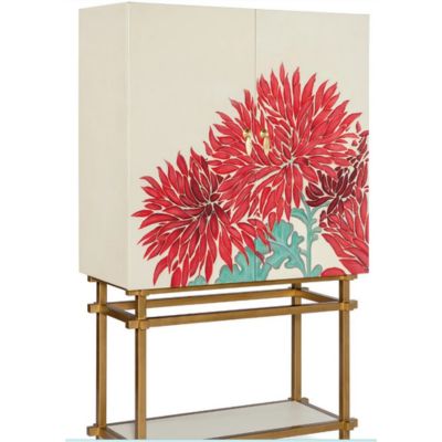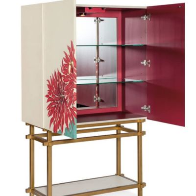 Pretty and polished, the Patrisha Bar Cabinet is a lovely, uplifting focal point packed with storage function. The cabinet has two linen-wrapped, handpainted doors and two adjustable glass shelves behind the doors, along with a mirrored back panel and a puck light in top. Crafted of wood and linen and tempered glass, the cabinet has a red interior with a gold metal base and gold pendant pulls.