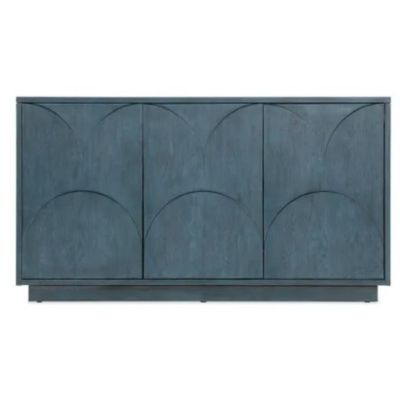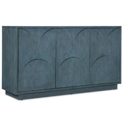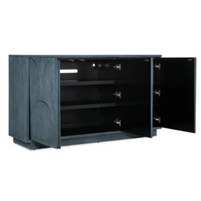 Brilliant in a soft blue finish with wood grain showing through and a subtle, oversized scallop motif on the door fronts, the Round Valley Entertainment Credenza sets the tone for a beautiful room. Accommodating up to a 65-inch TV, the credenza has 3 doors with soft-close hinges and push latches, two adjustable shelves behind the pair of left doors and one adjustable shelf behind the right side door. Vented back panel and 3-plug electrical outlet included.