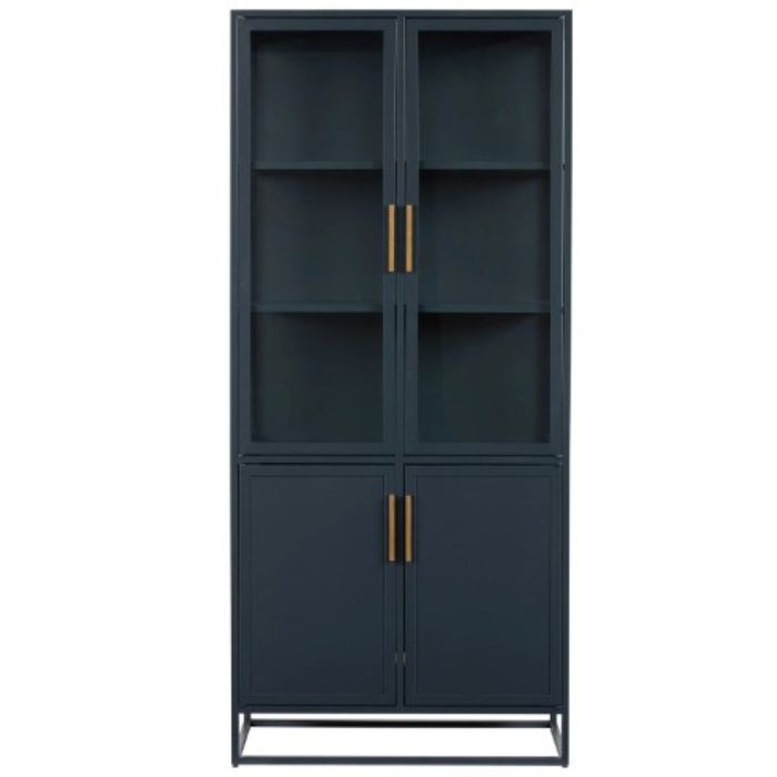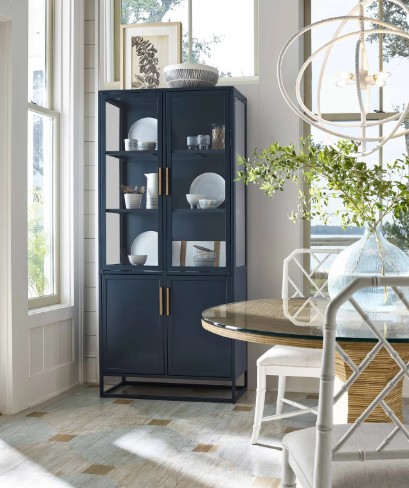 Add vertical storage to living areas with the Santorini Tall Metal Kitchen Cabinet, a serenely confident piece in a deep blue finish with clear glass door and sleek bronze bar hardware.