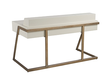 Contemporary designs in maple veneers and select hardwoods in a smooth ivory finish with custom hardware and decorative metal base in a warm silver leaf finish. Features include two soft close storage drawers and three lift lids on the desk top. The left and right open to concealed storage compartments while the center opens to two plug power supply with two USB charging jacks in a concealed compartment for cord management.