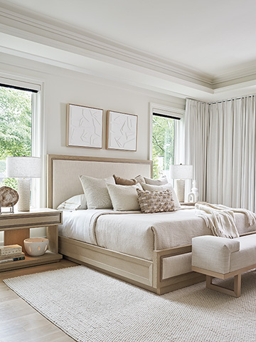 The Grayson bed features upholstered panels in the headboard and footboard framed by mitered trim in the Shadow finish. Chamfered moldings frame the perimeter of the side rails, which are lower to the floor, offering a more contemporary profile. The recessed plinth base gives the bed a floating appearance. The standard fabric is 2304-11 Biscayne a textured woven construction with a soft hand in a linen white coloration. However, the bed is also available in custom fabrics.