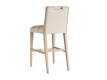 The Greer bar stools offer padded horizontal channels on the seat and back for remarkable comfort. Unique to the design is the integrated handle in the top rail. Welting frames the seat, back and wooden handle. A metal kick plate in the brushed champagne finish protects the footrest. Available in your choice of custom fabrics or leather.