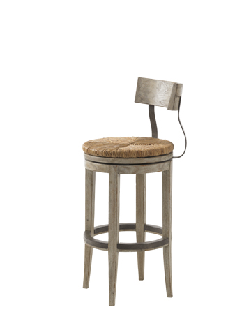 The concave back and serpentine vertical supports lend a softness to the silhouette that is enhanced by the round shape of the hand-woven rush swivel seat. The Driftwood finish highlights the use of metal on the backs of the stool and kick plate.