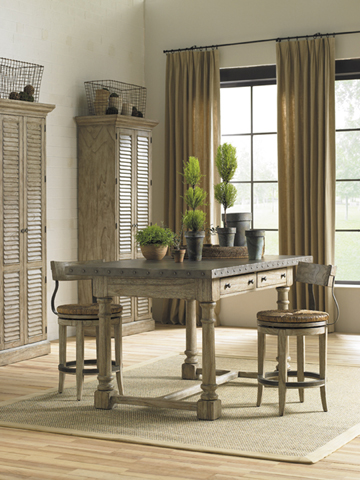 A personal favorite, the hammered stainless steel top with pewter nailhead trim is perfect with the Driftwood finish. The four drawers, two on each side, provide easy access to placemats, napkins, or utensils.