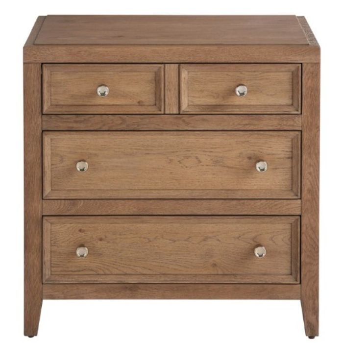 Accentuate bedsides with the Weekender Nightstand, designed with three spacious drawers and a simple silhouette. The calming knotty oak finish and dainty silver pulls add to its casually chic sensibility.