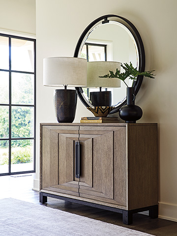 The Tripoli hall chest features a contemporary architectural design on the door fronts, with chamfered step-down moldings that draw the eye to custom hardware in the center. Behind the doors are two soft-close drawers at the top, two adjustable shelves in a large compartment on the right, and three adjustable shelves in a smaller compartment on the left.
